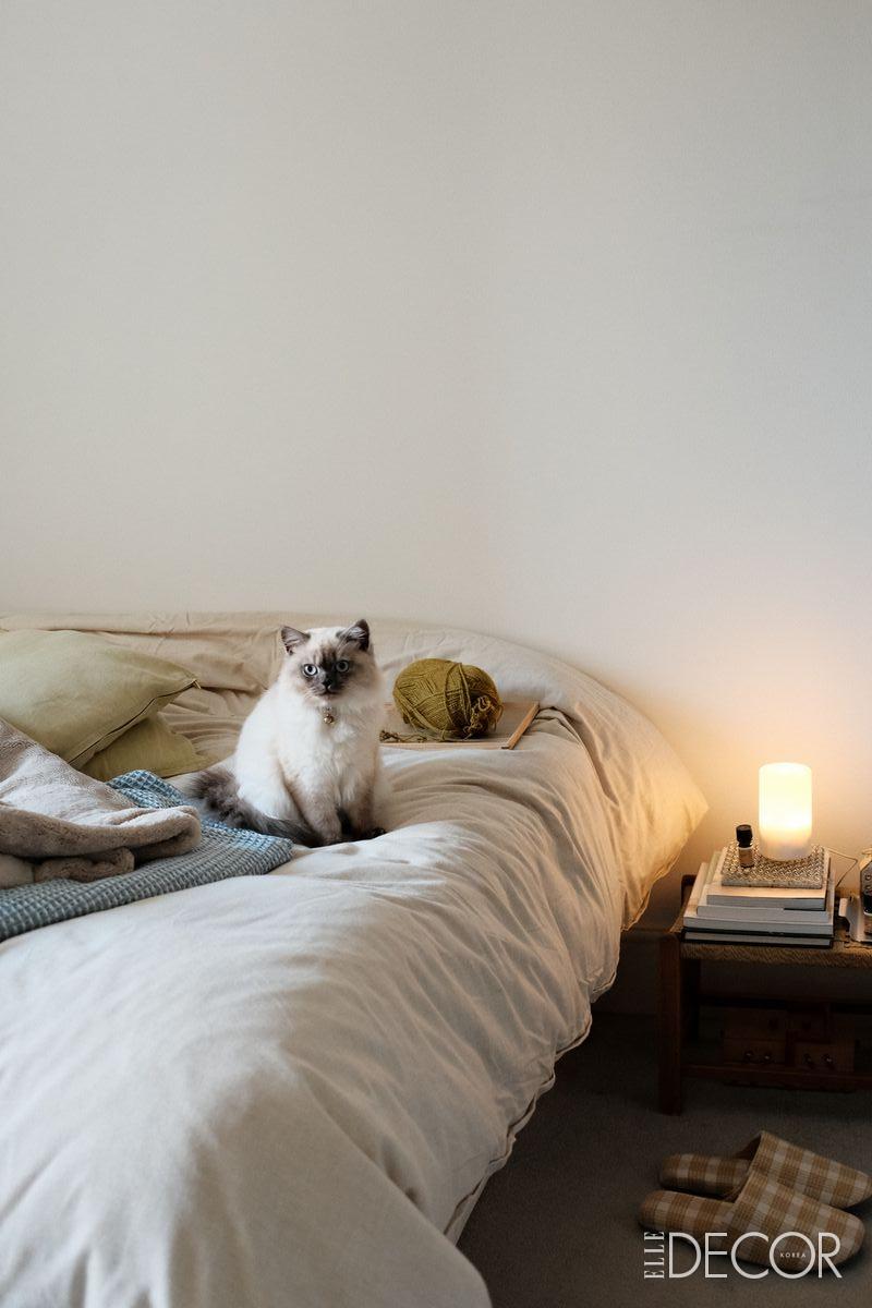 캣타워 등 반려동물을 위한 물건을 따로 들이진 않았어요. 대신 집 전체를 함께 쓰는 공간으로 생각하고 있죠. 창가에는 부드러운 담요를 놓아 고양이들이 편안하게 앉아 밖을 구경할 수 있게 했고, 선반 곳곳을 적당히 비워 자유롭게 오르내리도록 했어요. 높은 곳에 쉽게 올라 쉴 수 있도록요. 추운 날 카키와 퍼피는 라디에이터 근처에 머무르고, 저희가 밤샘 작업하는 날이면 카키와 퍼피도 작업실 책상에 올라와 함께 잠을 자요. 무언가 의도적으로 디자인하기보다는 고양이들이 이 집을 어떻게 사용하는지를 관찰하면서 곳곳을 조금씩 조정해 나가고 있습니다.