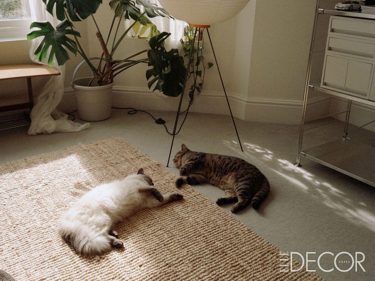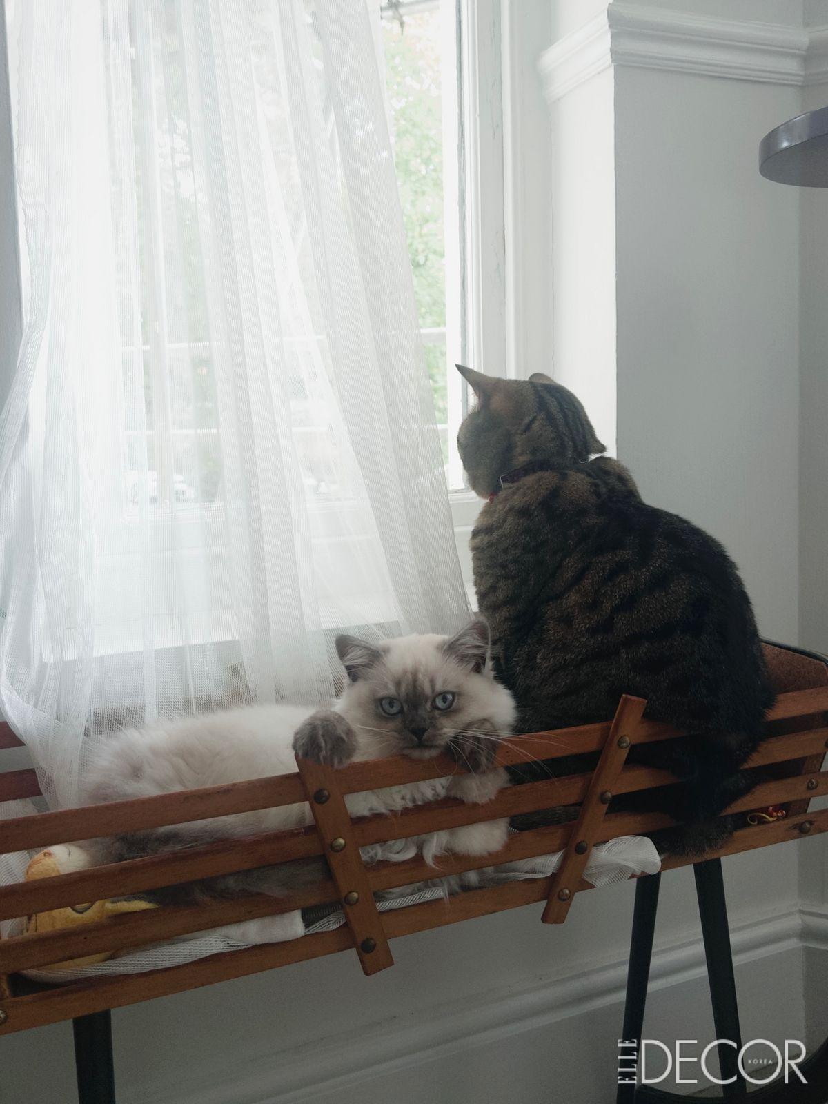 고양이들은 비트라(Vitra)의 사이드 체어를 특히 좋아해요. 이 의자 저 의자를 옮겨 다니며 결국 저희 자리마저 차지해 버리죠(웃음). 창가에는 미드센추리 플랜터를 두었는데요. 그 안에 화분을 놓지 않고 고양이들이 쉴 수 있는 자리가 되도록 했어요. 높이가 적당해서 카키와 퍼피가 밖을 구경하기 좋아요. 이케아의 LOHALS 러그도 유용해요. 면적이 넓은 데다 고양이들이 긁거나 누워 있기 좋아하는 소재라서죠. 이 러그 덕분에 카키와 퍼피가 다른 가구에는 별로 관심을 갖지 않는 것 같아요.