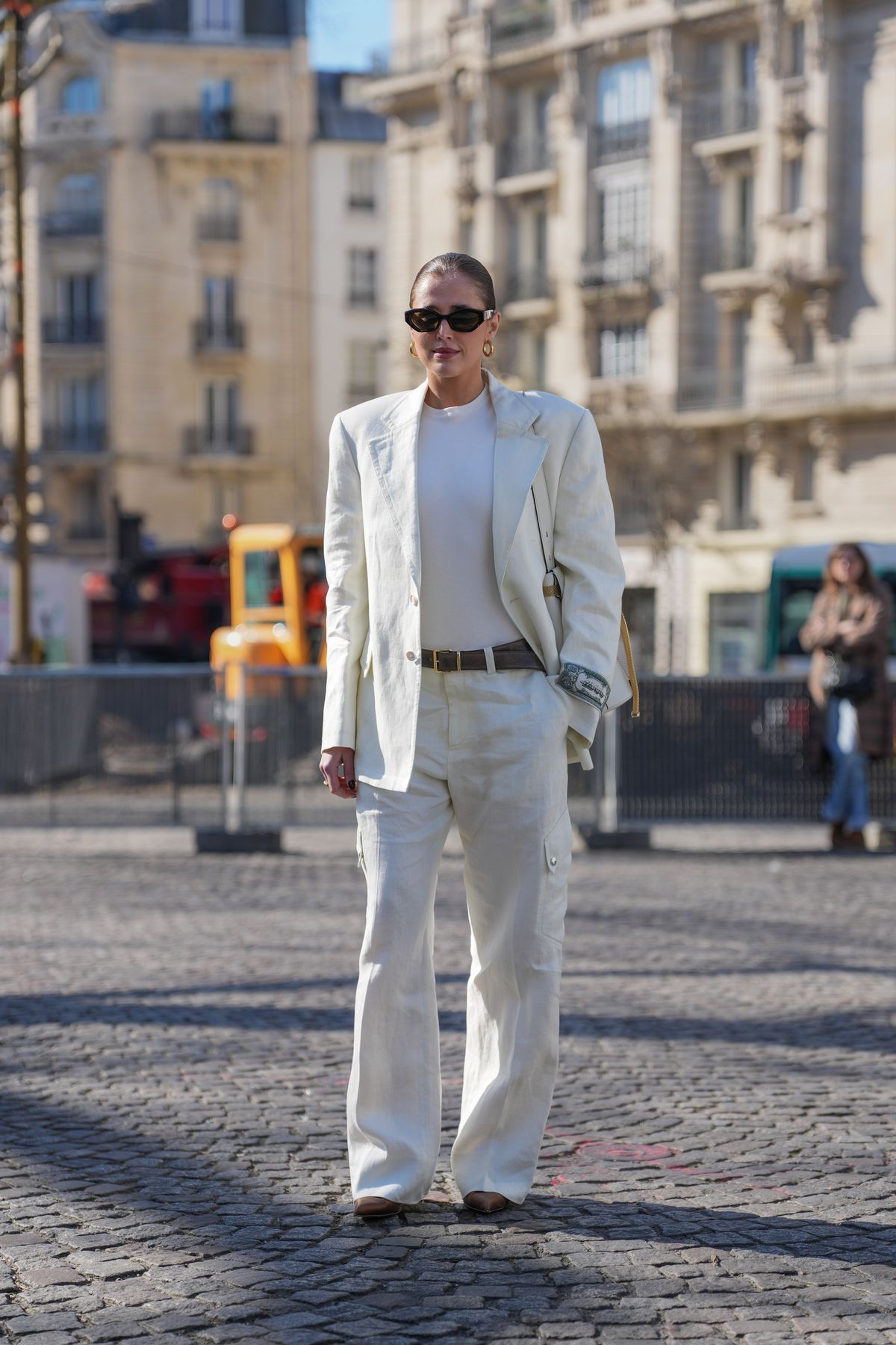 화이트 진이 캐주얼하다는 편견은 이제 내려놓아도 좋습니다. 깔끔한 화이트 톱, 오버사이즈 블레이저 그리고 힐을 더하면 충분히 포멀한 무드를 연출할 수 있습니다. 특히 상·하의를 화이트 톤으로 맞춘 뒤, 아우터로 구조감을 더하는 방식은 세련된 오피스 룩의 정석으로 통합니다. 무엇보다도 이 룩의 장점은 얼마든지 응용이 가능하다는 점입니다. 액세서리나 슈즈만 바꿔도 전혀 다른 분위기를 연출할 수 있는 만큼 바쁜 아침에도 빠르게 완성도 높은 룩을 만들 수 있죠.