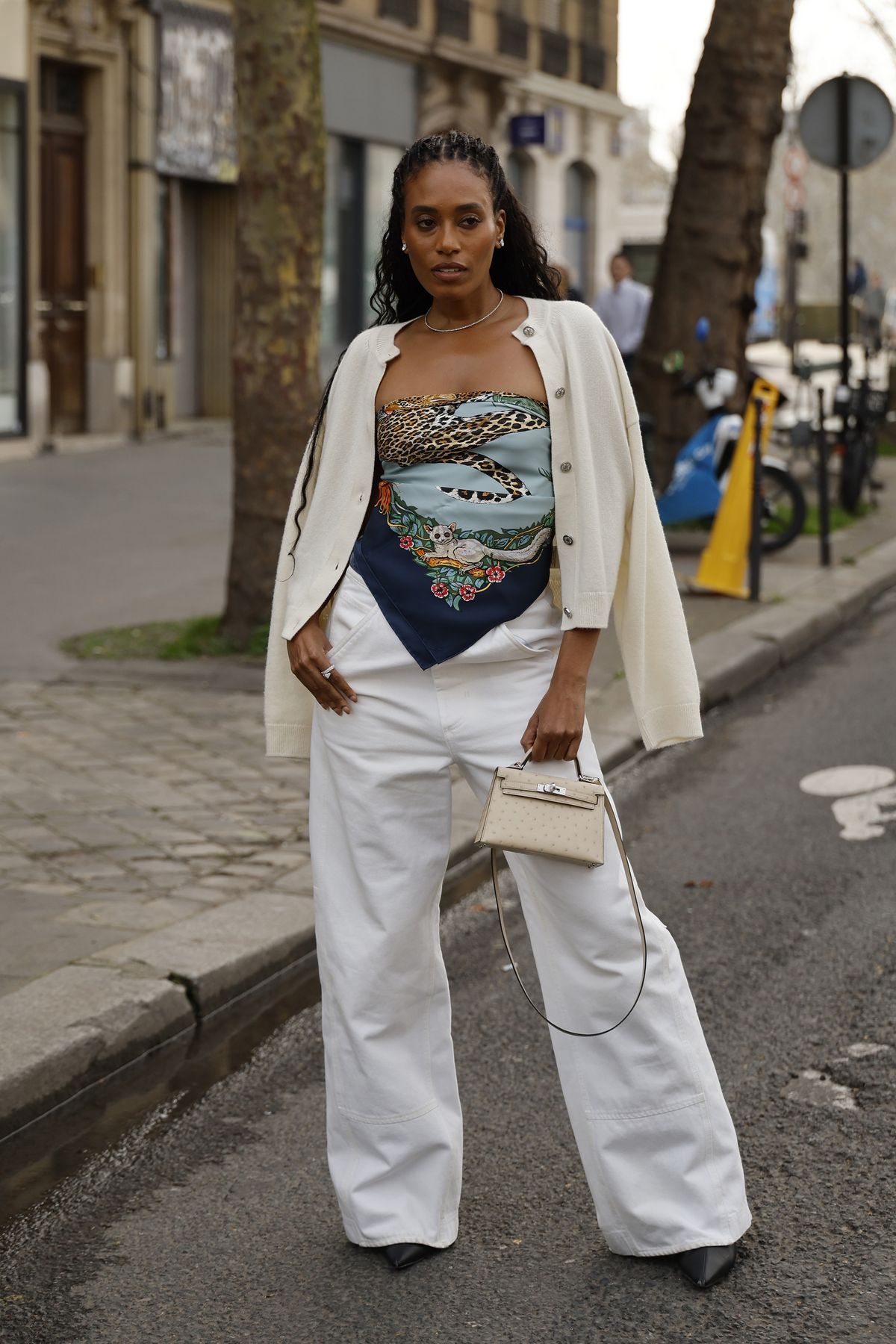 스카프를 활용한 스타일링은 2026년에도 여전히 강세입니다. 특히 반다나 형태로 변형해 톱처럼 연출하는 방식은 이번 시즌 더욱 눈에 띄죠. 여기에 가벼운 니트 카디건을 걸치면 계절감까지 자연스럽게 반영할 수 있습니다. 와이드 핏 화이트 진을 더하면 전체적인 실루엣이 한층 여유로워지고, 트렌디하면서도 부담스럽지 않은 균형이 완성됩니다. 과하게 꾸민 느낌 없이도 확실한 포인트를 줄 수 있죠.