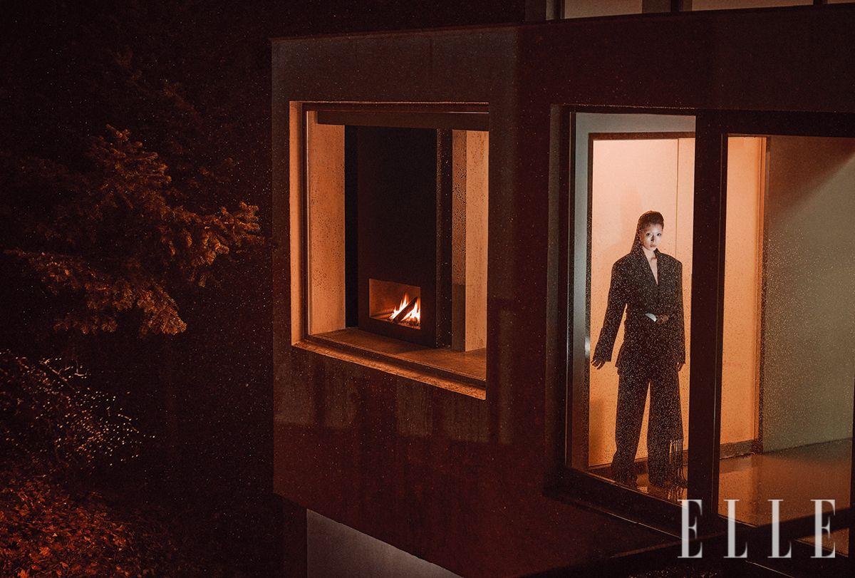 재킷과 팬츠, 허리에 두른 스카프는 가격 미정, 모두 Ferragamo. 메탈 벨트는 가격 미정, Celine. 펌프스는 가격 미정, Roger Vivier.