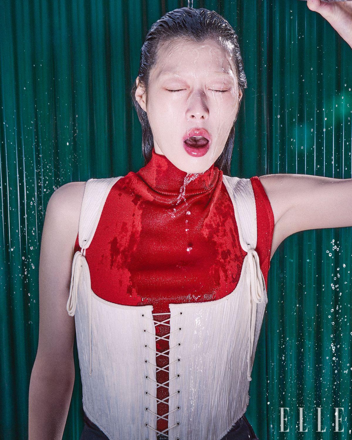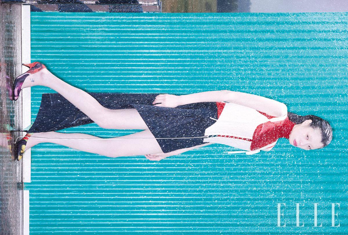 코르셋 톱은 가격 미정, Gyouree Kim. 터틀넥 니트 톱과 스커트는 가격 미정, 모두 Loewe. 펌프스는 가격 미정, Versace.