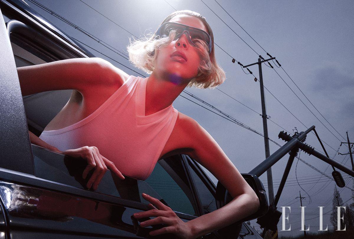톱은 가격 미정, Versace. 선글라스는 가격 미정, Miu Miu.