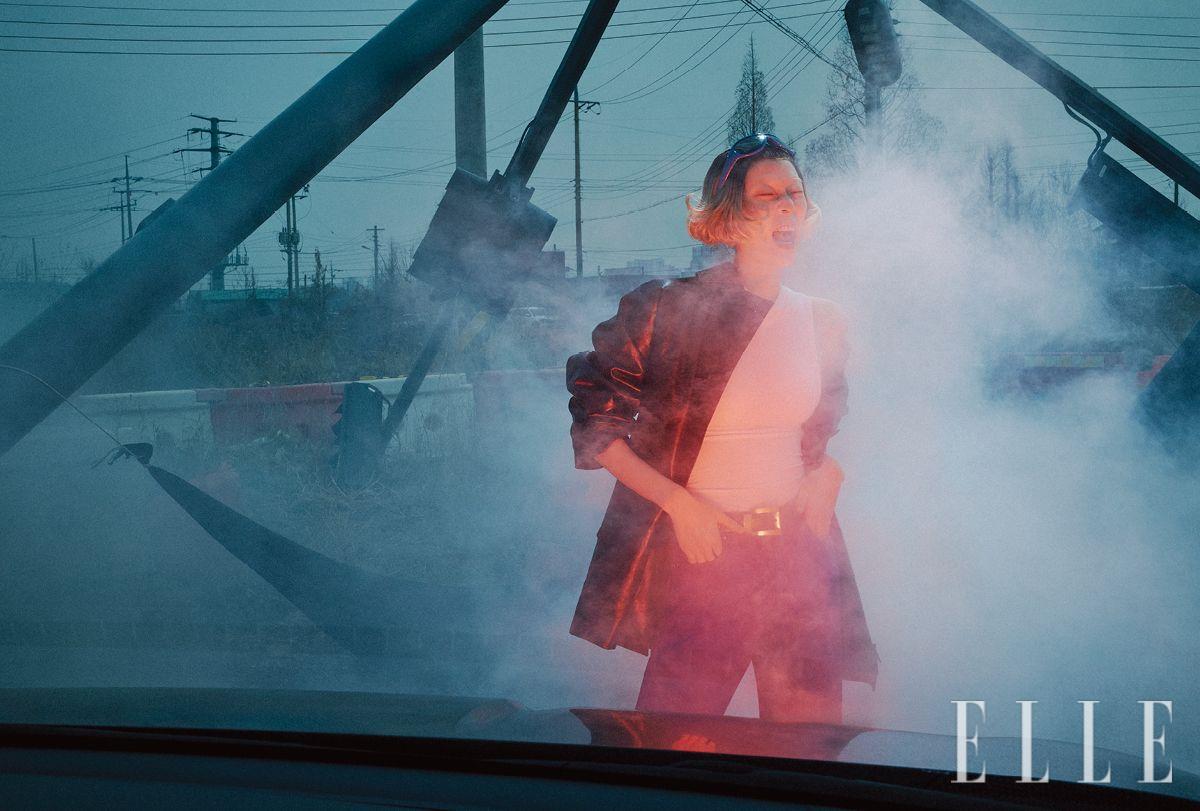 레더 재킷은 가격 미정, Prada. 톱과 팬츠, 벨트는 가격 미정, 모두 Versace. 선글라스는 가격 미정, Miu Miu.
