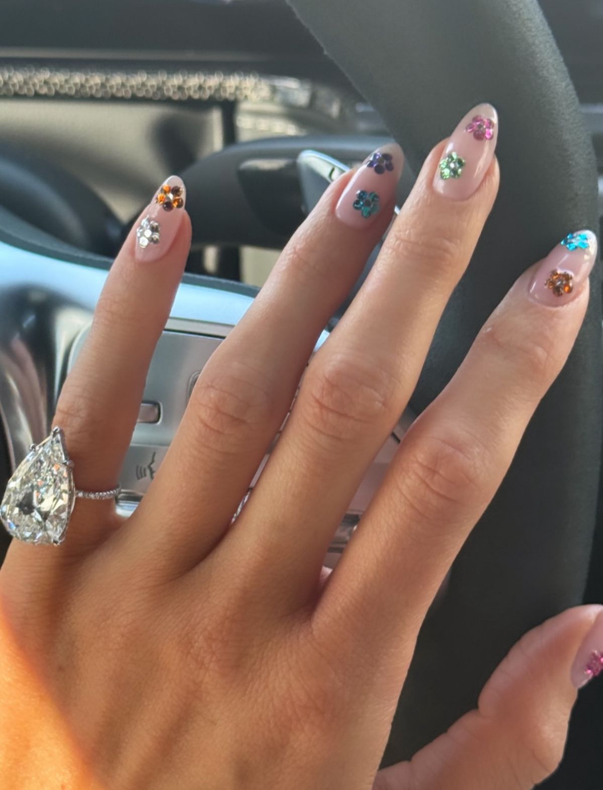 카일리 제너의 네일 아트 역시 졸라 갠조릿의 손끝에서 완성됐습니다. 시럽처럼 묽은 누드 핑크 베이스 위에 알록달록한 크리스털을 얹어 플라워 패턴을 만들어냈죠. 핑크, 그린, 블루, 오렌지 톤의 반짝이는 포인트를 더해 한층 경쾌하고 러블리한 네일 아트가 탄생했습니다.