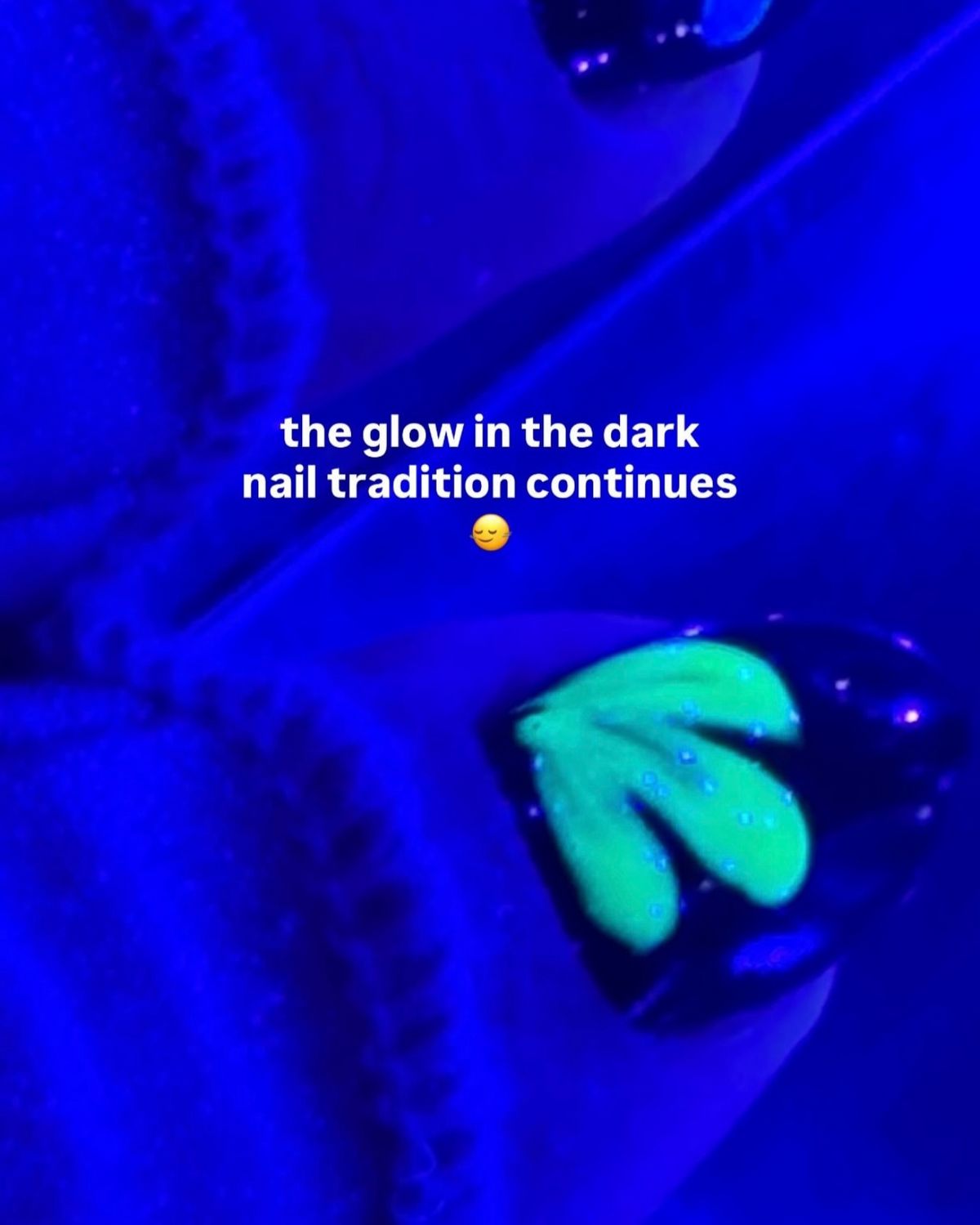 헤일리 비버는 유경험자답게 네일 아트도 똑똑하게 선택했습니다. 블랙 컬러 베이스 위에 그린과 블루 톤의 플라워 모티프의 아트를 얹은 모양이었죠. 여기에 그만의 킥은 바로 낮과 밤의 반전을 노린 디자인입니다. 어두운 곳에서는 플라워 패턴이 야광처럼 빛나며 전혀 다른 분위기를 연출해주죠. 화려한 장식 대신 네온 포인트로 밤에 더욱 강렬하게 돋보이는 센스가 돋보이는 디자인입니다.