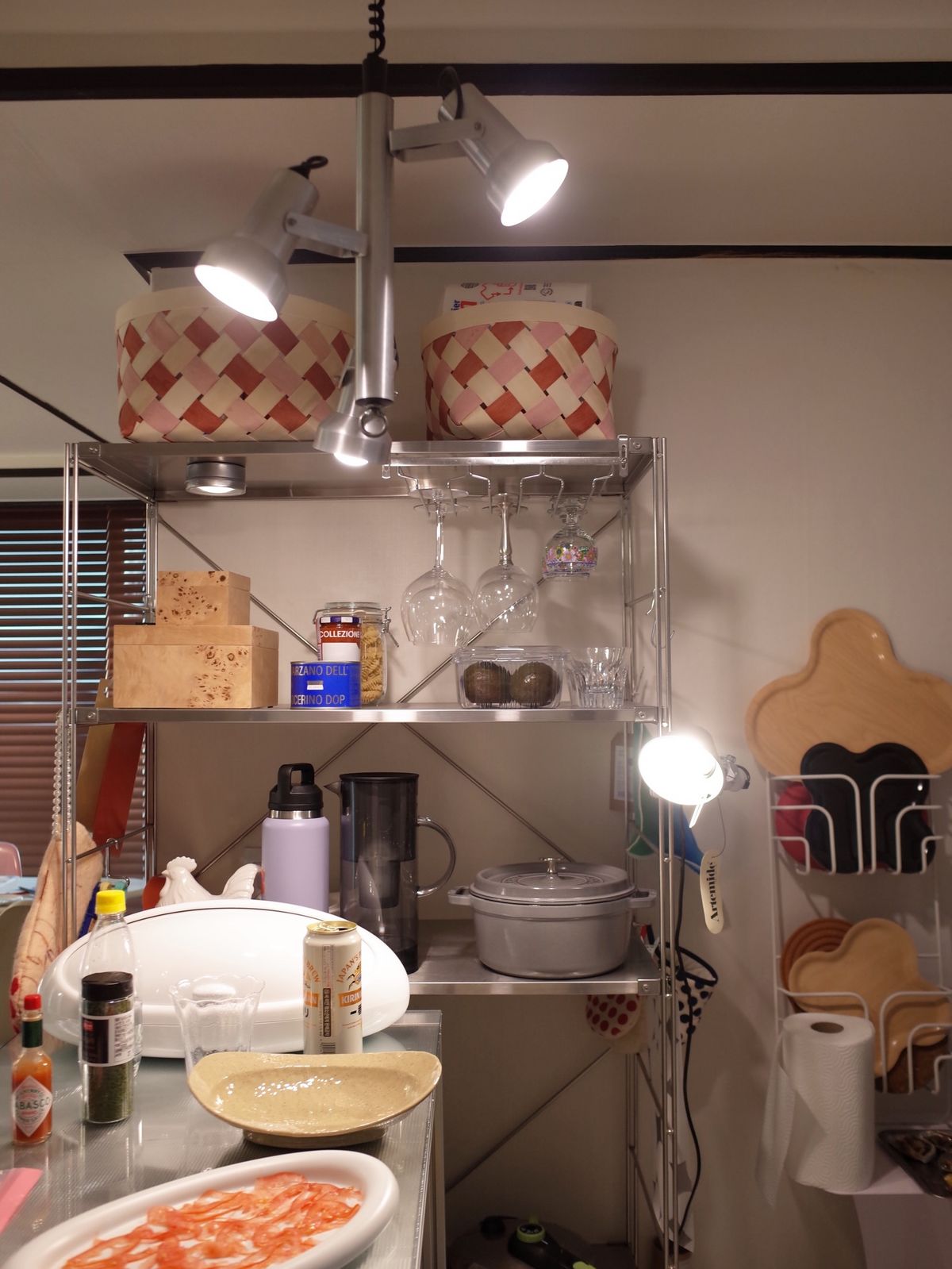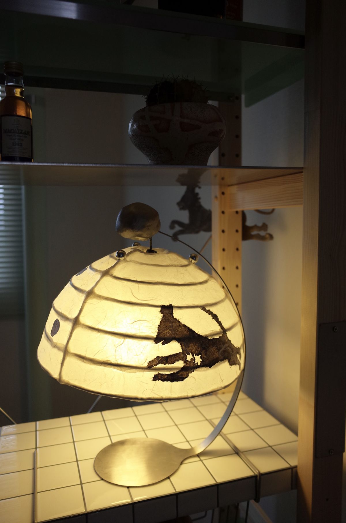 선반 위에 있는 조명도 직접 만들었는데요. 어느 날 다이소에서 유니크한 모양에 바나나 걸이를 보고 한참 들여다보니 신기하게도 딱 저 조명이 머릿속에서 그려지더라고요.