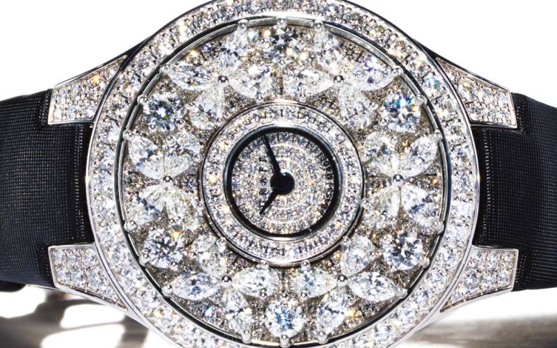 다이아몬드를 세팅한 까나쥬 패턴의 화이트골드 라 디 마이 디올 타임피스는 가격 미정, Dior Timepiece.