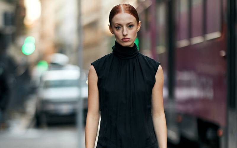 회기가 도는 세이지 그린은 피부 톤에 자연스럽게 스며들어 우아한 매력을 발산합니다. 여기에 무릎까지 올라오는 반스타킹은 룩에 빈티지한 뉘앙스를 더할 수 있죠. 특유의 탁함 때문에 자칫 답답해 보일 수 있지만 광택이 흐르는 슬립 드레스와 묵직한 아우터를 섞어 조화를 만들어냈습니다. 차분한 그린이 화려한 소재를 만나 매력적인 믹스매치룩으로 거듭난 스타일링입니다.