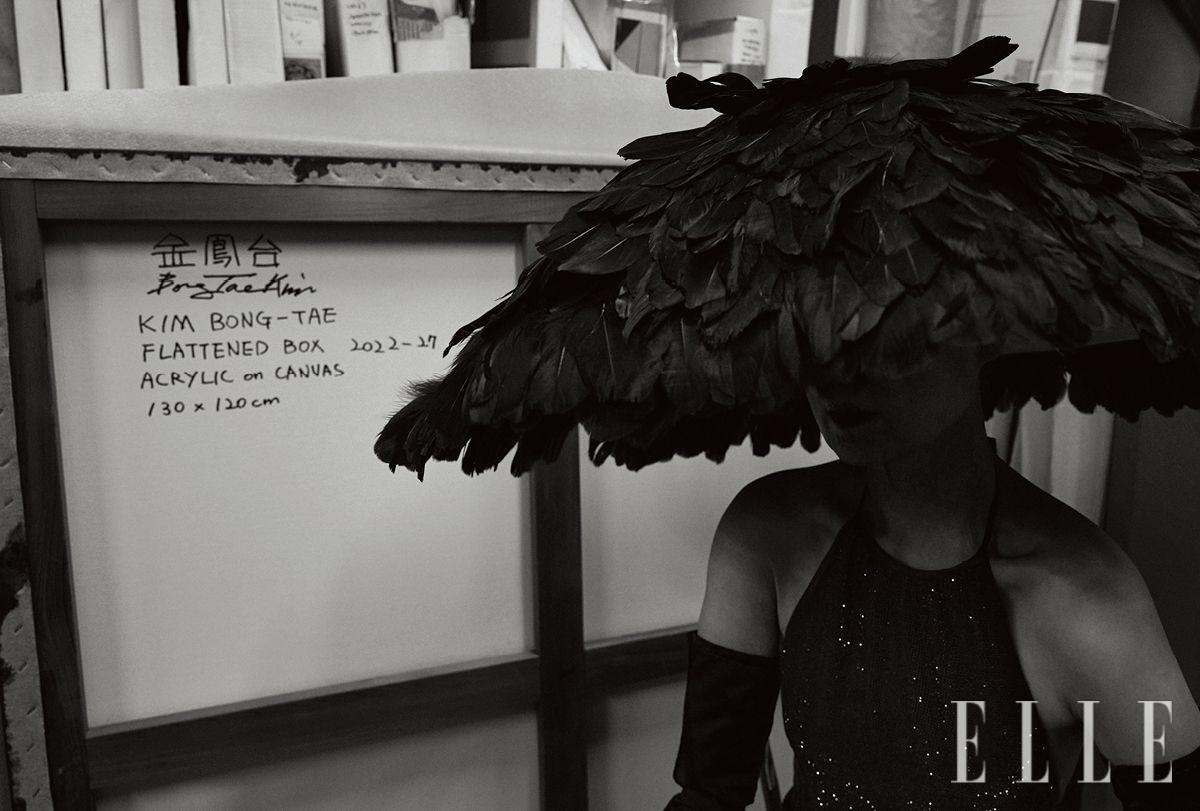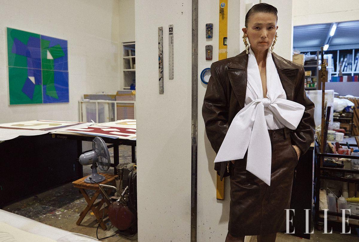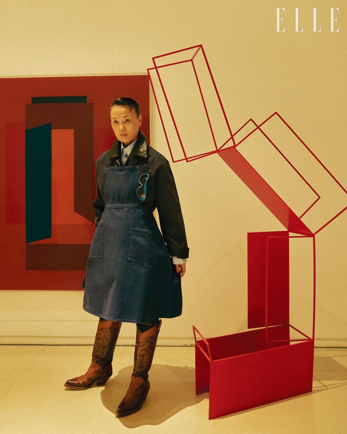 레더 칼라 디테일의 워크재킷과 에이프런, 셔츠, 팬츠, 블루 프레임의 선글라스는 가격 미정, 모두 Miu Miu. 웨스턴 부츠는 가격 미정, Gabriela Hearst. 왼쪽 캔버스 작품은 플래튼드 박스(Flattened Box),빨강색 조각 작품은 댄싱 박스 시리즈 (Dancing Box Series), 모두 김봉태 작가.