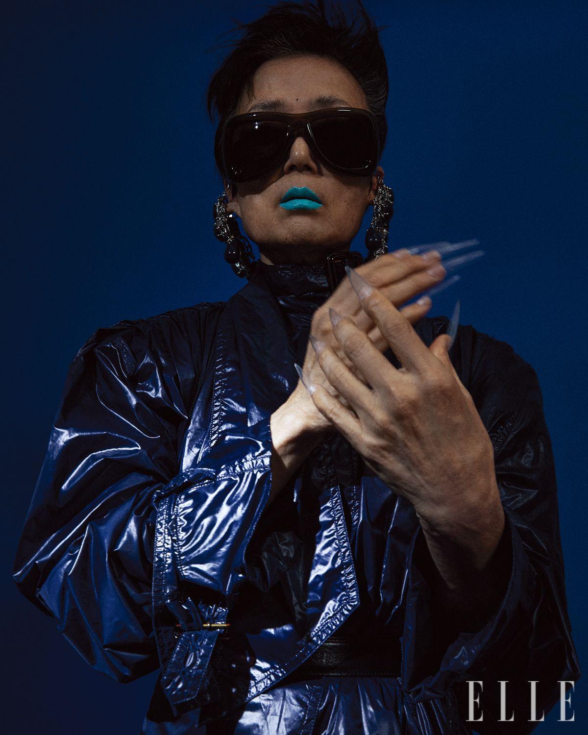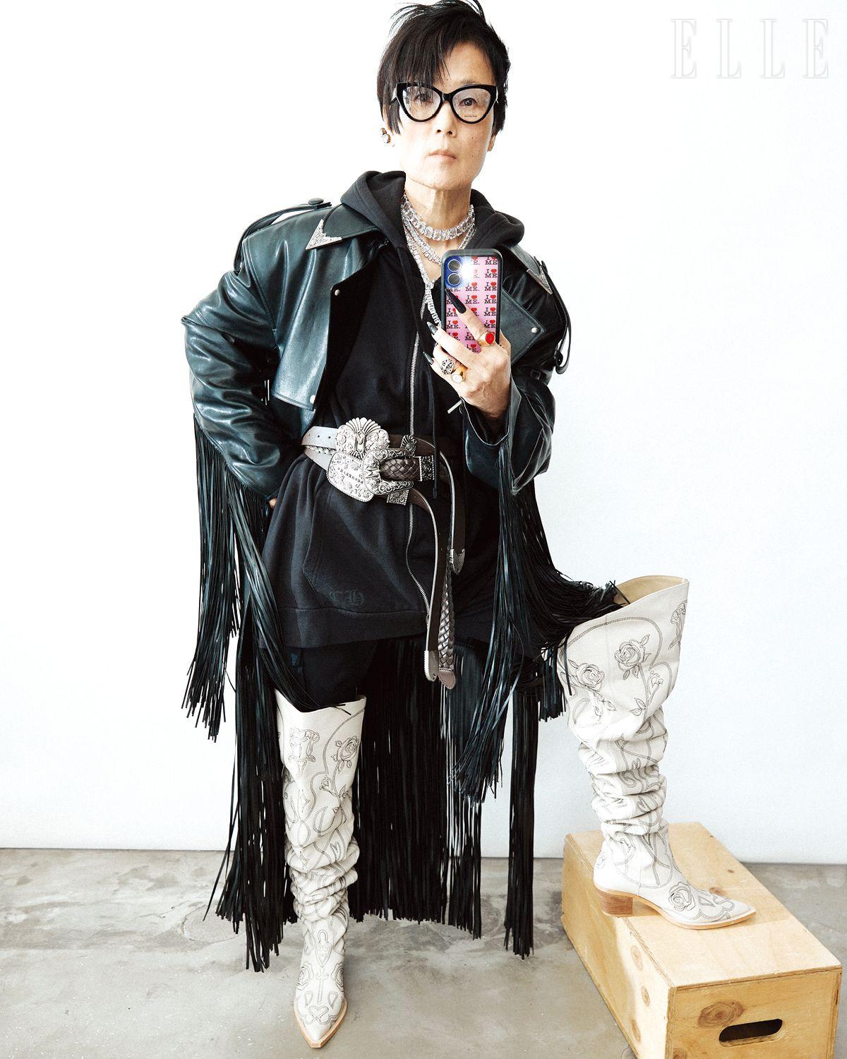 레더 프린지 디테일의 코트와 팬츠, 사이하이 웨스턴 부츠, 레이어드한 벨트는 가격 미정, 모두 Markgong. 후디드 톱과 약지에 착용한 실버 링은 가격 미정, 모두 Chrome Hearts. 캐츠 아이 안경은 가격 미정, Balenciaga by Kering Eyewear. 레이어드 네크리스는 2백40만원, Swarovski. 스톤 이어링은 가격 미정, Balenciaga. 왼손 검지와 중지에 착용한 로고 시그넷 링은 가격 미정, 모두 Celine.