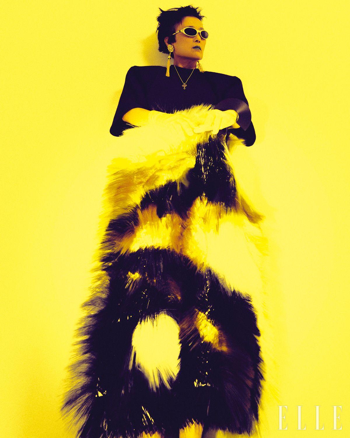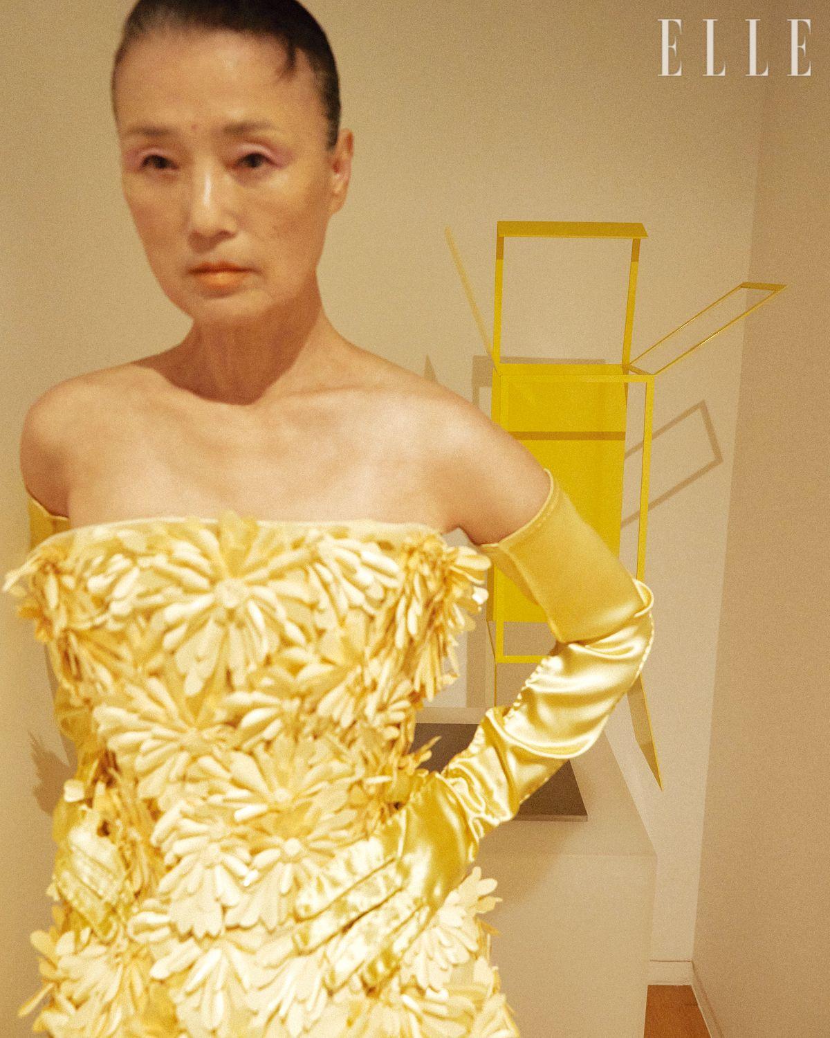 플라워 장식의 드레스는 가격 미정, Balenciaga. 새틴 롱 글러브는 가격 미정, Prada. 노랑색 조각 작품은 댄싱 박스 시리즈(Dancing Box Series), 김봉태 작가.