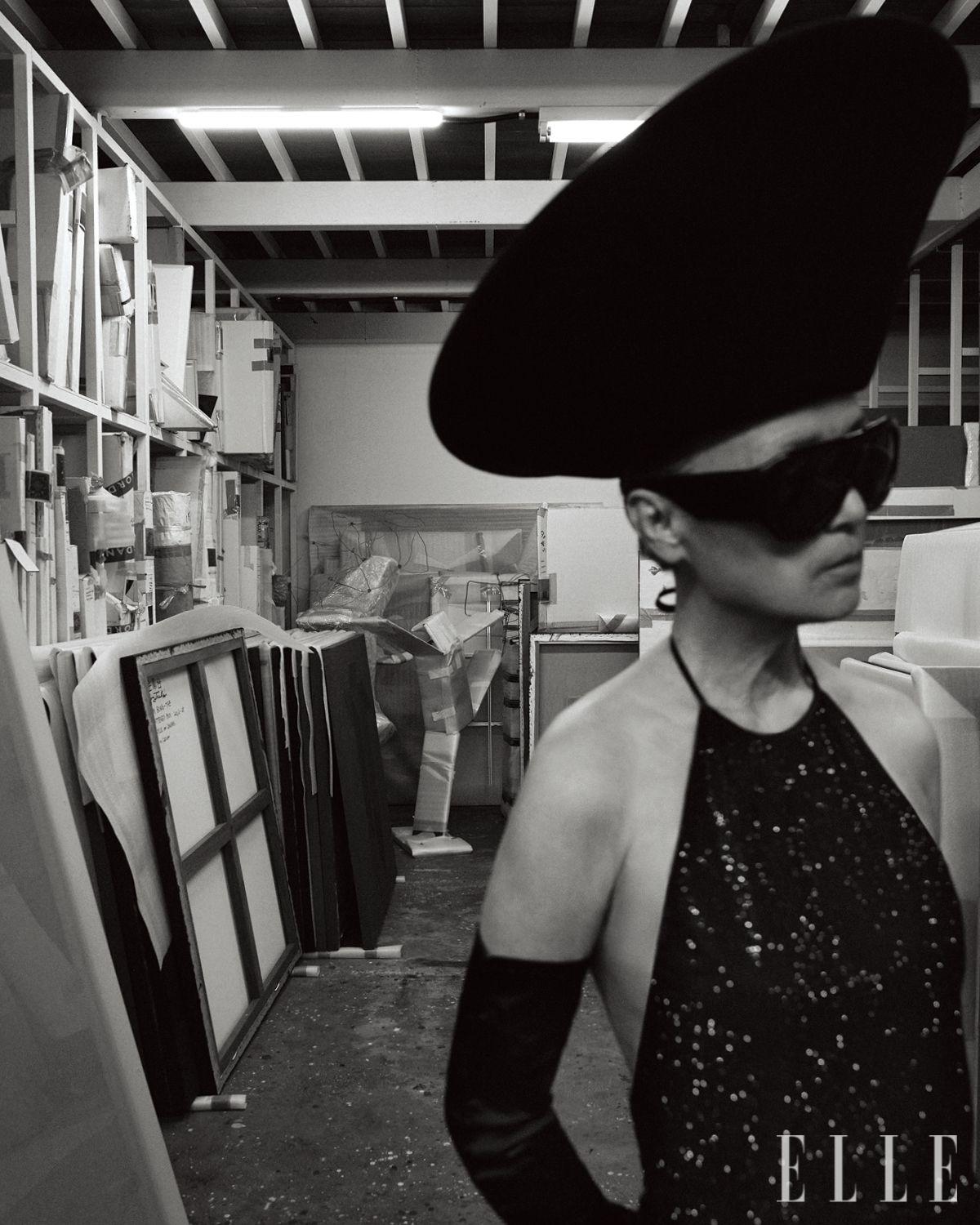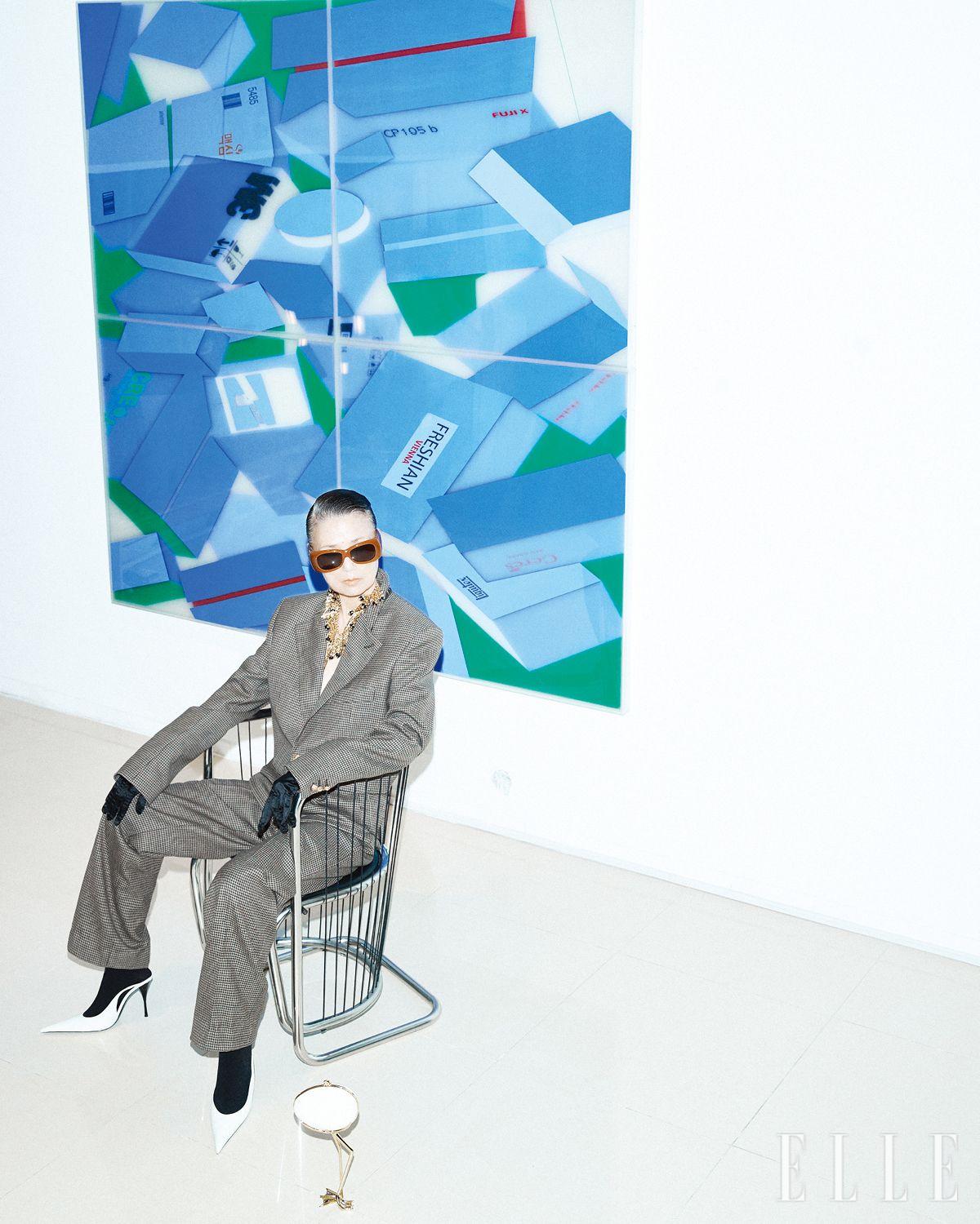 체크 재킷과 팬츠, 밀 모티프의 네크리스, 바닥에 놓인 달걀 모티프의 백은 가격 미정, 모두 Chanel. 선글라스와 스틸레토 힐은 가격 미정, 모두 Saint Laurent by Anthony Vaccarello. 새틴 글러브는 가격 미정, Prada. 삭스는에디터 소장품. 벽에 걸린 작품은 축적(Accumulation), 김봉태 작가.
