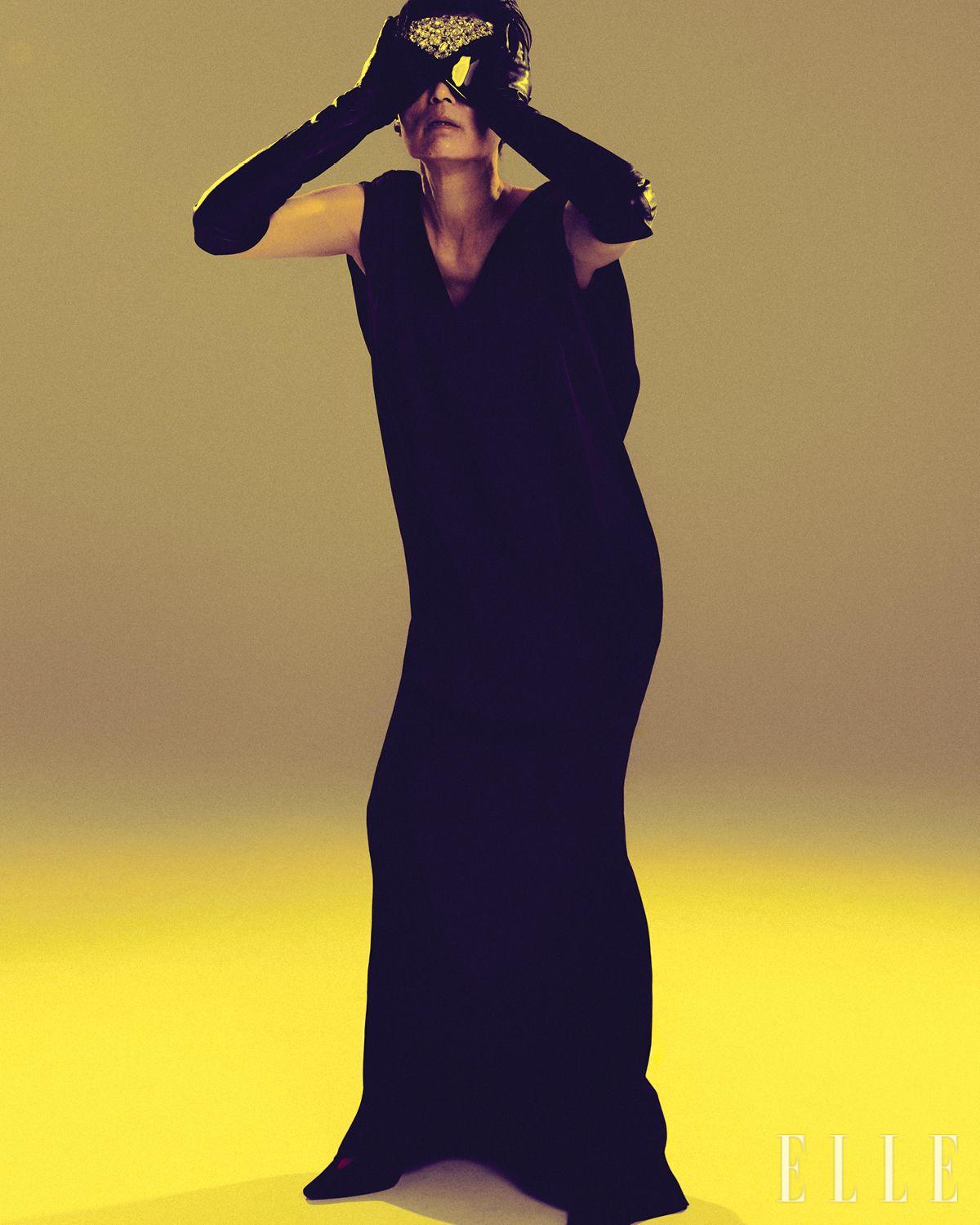 시퀸 디테일의 홀터넥 드레스는 가격 미정, Gucci. 새틴 롱 글러브는 가격 미정, Prada. 조형적인 깃털 모자는 에디터 소장품.