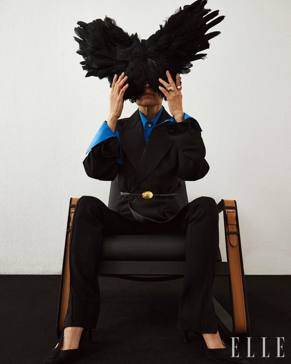 재킷과 와이드 커프스 셔츠와 팬츠, 메탈 장식 벨트, 시그넷 링은 가격 미정, 모두 Celine. 캔버스 펌프스는 가격 미정, Prada. 나비 모티프의 깃털 장식 마스크는 에디터 소장품.