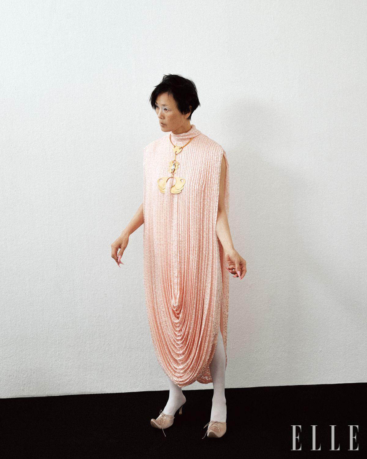 플리츠 드레스는 가격 미정, Louis Vuitton. 나비 모티프의 메탈 네크리스는 가격 미정, Valentino Garavani. 포인티드 토 뮬은 39만8천원, Gyouree Kim. 스타킹은 에디터 소장품.