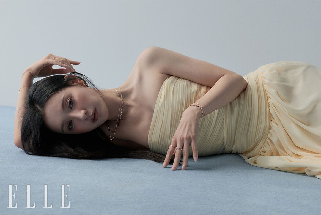 18K 화이트 골드 소재에25캐럿 천연 화이트 다이아몬드 600피스를 세팅한 티아라, 14K 화이트 골드 소재의 벨라 이어링과 벨라 네크리스, 벨라 펜던트, 오른손 검지와 약지에 착용한 14K 화이트 골드 소재의 벨라 링과 벨라 브레이슬릿, 왼손 검지에 착용한 14K 화이트 골드 소재의 벨라 링, 약지에 착용한 14K 화이트 골드 소재에 1캐럿 랩 다이아몬드를 세팅한 벨라 링, 14K 화이트 골드 소재의 벨라 브레이슬릿, 레이어드한 벨라 브레이슬릿은 모두 STONEHENgE.