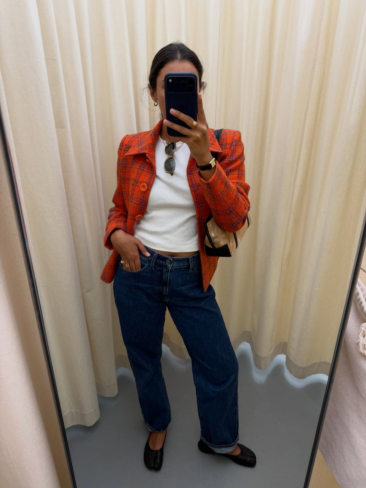발레 플랫의 진가는 익숙한 청바지를 만났을 때 비로소 드러납니다. 헐렁한 배기진과 탱크톱이라는 지극히 일상적인 차림을 파리지앵 같은 감도로 격상시키는 투 톤 플랫의 존재감을 보세요. 심지어 짙은 스트레이트 청바지와 강렬한 레드 체크 재킷이 만난 순간에도 군더더기 없는 블랙 발레 플랫은 가장 드레시한 룩을 완성하는데요. 운동화였다면 평범했을, 혹은 샌들이었다면 가벼웠을 청바지가 오직 발레 플랫 하나로 가장 섬세한 마침표를 찍게 되는 셈이에요.