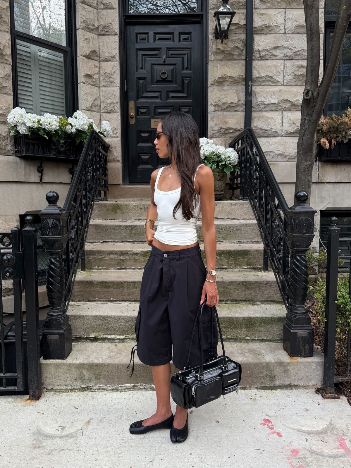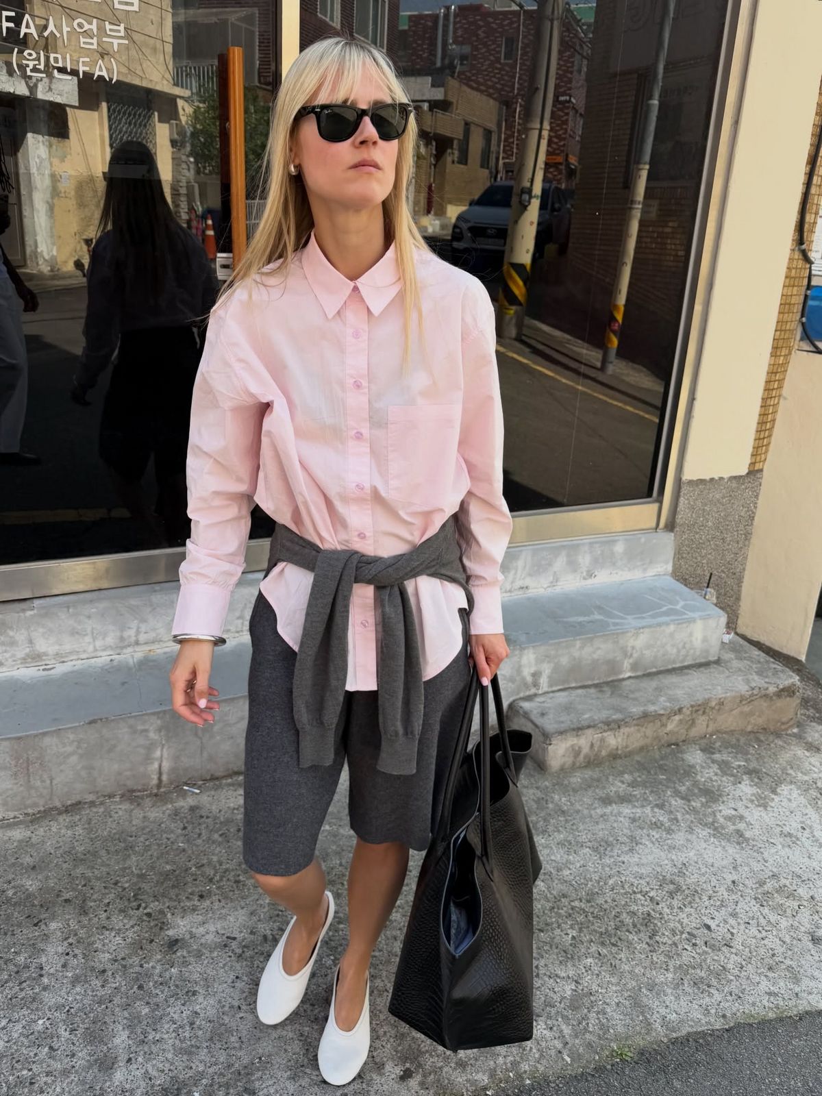무릎까지 넉넉하게 내려오는 버뮤다 팬츠는 이번 시즌 결코 놓칠 수 없는 키워드죠. 투박하고 중성적인 바지 아래 심플하기 그지없는 블랙 발레 플랫을 더해보세요. 팬츠의 볼륨감과 대비되는 가느다란 발등 라인이 극강의 절제된 미니멀리즘을 연출하는데요. 조금 더 극적인 정화가 필요하다면 핑크 셔츠와 그레이 버뮤다 바지에 화이트 플랫을 더한 룩이 정답이에요. 정갈하게 차려입은 듯하면서도 왠지 모를 순수함이 느껴지는 청순한 변주죠.