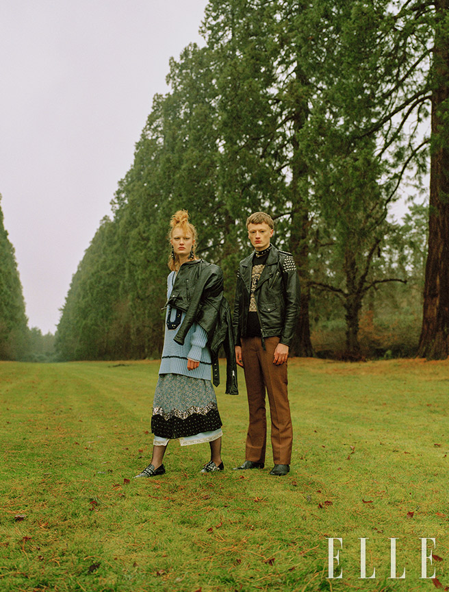 (왼쪽) 올더니가 입은 빈티지 레더 재킷은 2558파운드, Re/Done. 니트 풀오버는 550파운드, 플라워 패턴과 레이스 소재가 믹스된 스커트는 550파운드, 모두 Coach 1941. 버클 장식의 에나멜 로퍼는 357파운드, Yuul Yie. 나일론 타이츠는 4.99파운드, Pamela Mann. 깃털과 유리 소재가 믹스된 이어링은 290파운드, Ranjana Khan. (오른쪽) 도허티가 입은 스터드 장식의 레더 재킷은 599파운드, Tiger of Sweden. 프린트 셔츠는 150파운드, 브라운 팬츠는 195파운드, 모두 Coach×Keith Haring. 레더 부츠는 385파운드, Russell & Bromley. 레더와 니켈로 이뤄진 초커는 190파운드, Moschino.