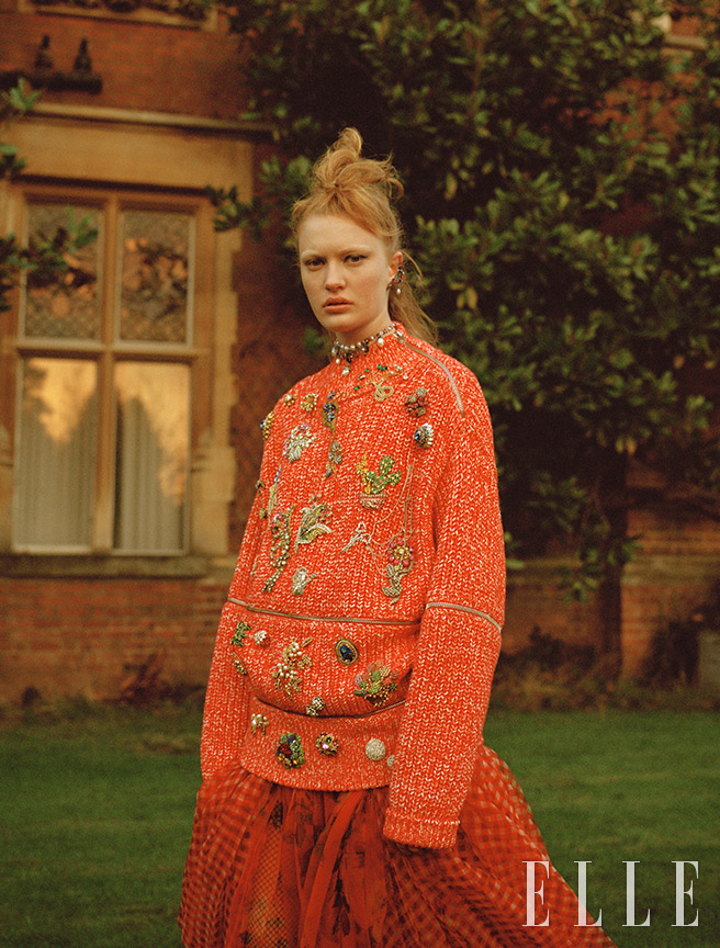 빈티지 주얼 장식이 달린 울 스웨터는 6975파운드, 오간자 스커트는 6540파운드, 앤티크 무드의 실버와 크리스털 구슬이 장식된 네크리스는 845파운드, 앤티크 실버와 크리스털로 이뤄진 이어링은 가격 미정, 모두 Alexander McQueen.