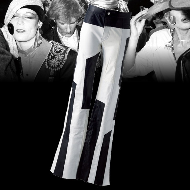 기하학적 패치워크 패턴의 레더 팬츠는 가격 미정, Celine.