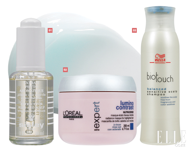 1 시슬리 엑스트레 휘또 아로마띠끄 \135,000 두피를 위한 식물성 집중 트리트먼트 에센스, 30ml. 2 웰라 프로페셔널 바이오터치 밸런스드 센서티브 스캘프 샴푸 \20,000 두피와 헤어의 유수분 밸런스를 맞춰줌, 250ml. 3 로레알 프로페셔널 파리 루미노 컨트라스트 마스크 가격 미정 수영장 소독물에 의한 염색 모발의 변색 방지, 200ml.