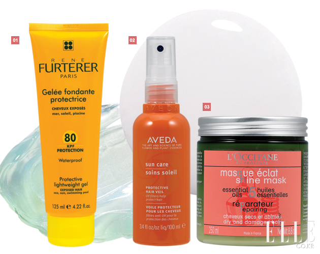 1 르네 휘테르 선 케어 젤 46,000 외출 전 바르면 자외선을 차단하고 탈수를 방지해주는 헤어 젤, 125ml. 2 아베다 선 케어 프로텍티브 헤어 베일 32,000 태양 광선에 의한 탈색, 건조 현상 예방 하는 헤어 스프레이, 100ml. 3 록시땅 아로마 리페어 헤어 마스크 40,000 5가지 이센셜 오일이 건조하고 갈라지는 모발을 재생, 250ml.