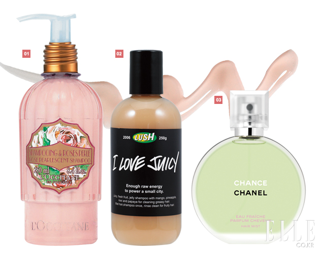 1 록시땅 로즈 펄 샴푸 28,000 4가지 종류 장미가 배합된 로즈 칵테일 향취가 하루종일 지속, 250ml. 2 러쉬 아이 러브 주시 샴푸 25,900 방금 짜낸 과일처럼 상큼한 트로피컬 향기, 모발에 수분 공급, 250g. 3 샤넬 샹스 오 프레시 헤어 미스트 55,000 상큼한 시트러스 향취의 헤어 전용 프래그런스, 35ml.