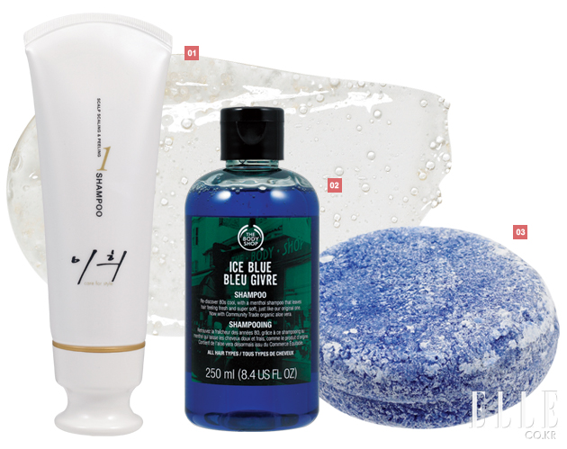 1 이희 케어 포 스타일 1번 샴푸 27,000 로즈메리와 민트 성분이 두피 스케일링 효과 부여, 210ml. 2 더바디샵 아이스 블루 샴푸 14,500 멘톨 성분의 두피 쿨링 효과, 커뮤니티 트레이드로 생산된 알로에 베라 함유, 250ml. 3 러쉬 점핑 주니어 17,500 과도한 유분을 잡아주는 딥 클렌징 샴푸 바, 55g.
