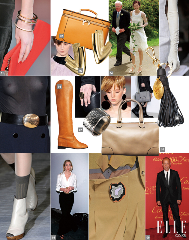 JEWELRY 이번 시즌에는 브로치를 꼭 장만해야 한다. 금방이라도 날아가버릴 듯한 발렌티노의 나비 브로치와 할머니의 보석함에서 꺼낸 듯한 액자와 코인들이 달린 돌체 앤 가바나의 클립, 클래식한 디자인의 에르메스와 샤넬의 브로치는 가슴팍에 달아도 좋고, 모자나 스커트에 달아도 예쁘다. 브로치가 없다면 앤티크 주얼리에서 영감을 받은 듯한 목걸이나 뱅글로 포인트를 줄 것. 오스카 드 라 렌타 쇼에 선 모델의 손가락에 끼워진 끊어질 듯 가느다란 반지도 여성스러움을 강조하는 액세서리다.