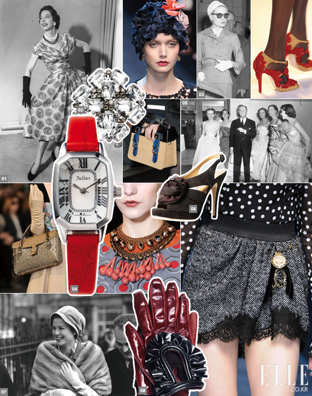 1 무슈 크리스챤 디올의 아워글라스 실루엣 2 일모스트닷컴의 브로치 3 시크하면서도 페미닌한 스커트 수트에 독특한 모자를 매치한 그레이스 켈리 4 줄리어스의 손목시계 5 무슈 디올과 그의 앤젤들 6 발렌티노의 샌들 7 부드러운 보닛과 진주 귀고리로 여성스러움을 강조한 그레이스 켈리 8 프라다의 글러브