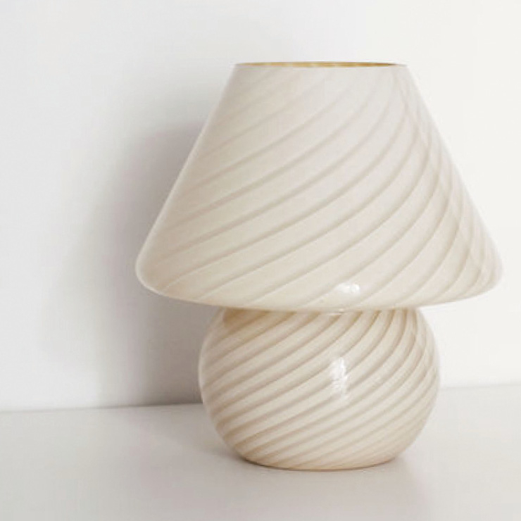 이탈리아의 작은 섬 무라노는 유리공예로 유명한 지역. 스파이럴 형태의 직선이 전체를 아우르는 버섯 모양의 램프가 잘 알려져 있다. 파스텔 톤의 램프 몸체에 백열전구를 끼워 불을 켜면 따뜻하고 사랑스러운 빛이 새어 나온다. 무라노 머시룸 램프