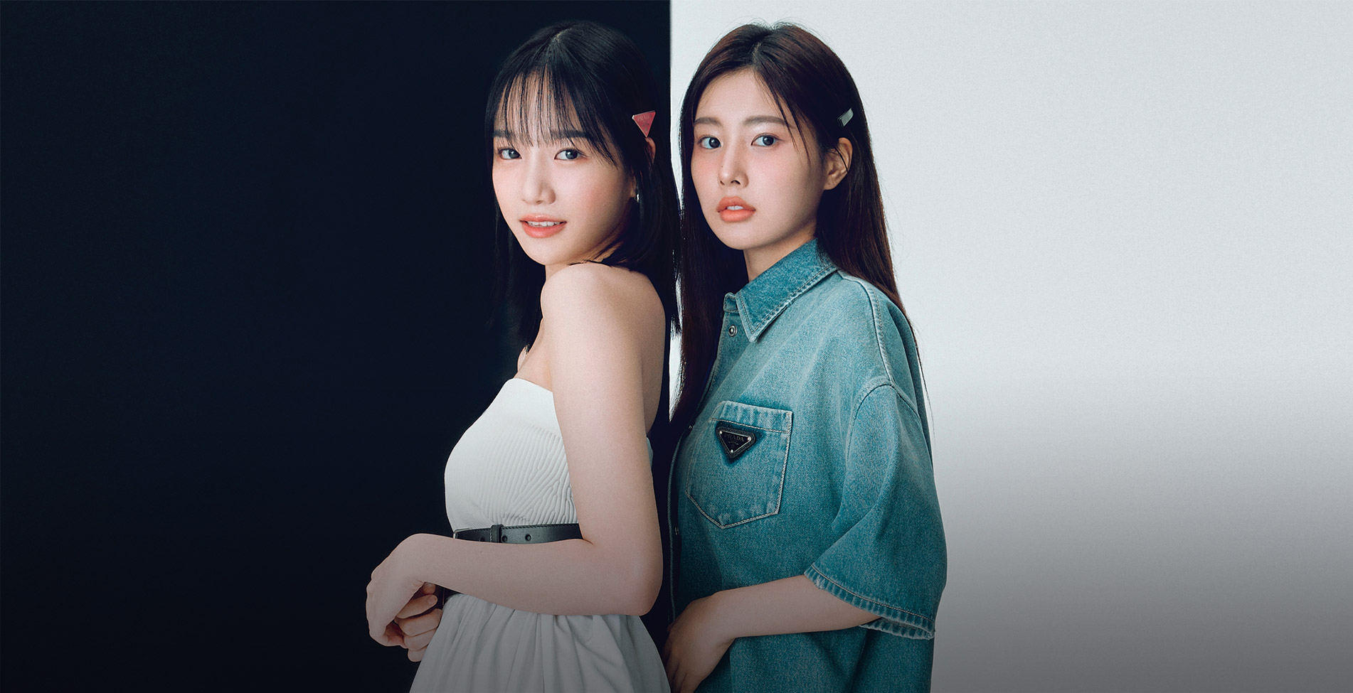 유리가 입은 화이트 원피스와 벨트는 모두 Alexander McQueen. 웨스턴 부츠는 Odd One Out. 헤어핀은 Prada. 이어링은 Edeen. 혜원이 입은 데님 점프수트와 로퍼, 삭스는 모두 Prada.