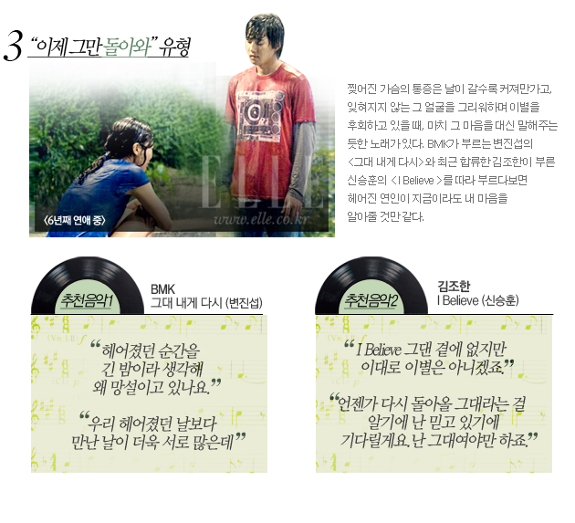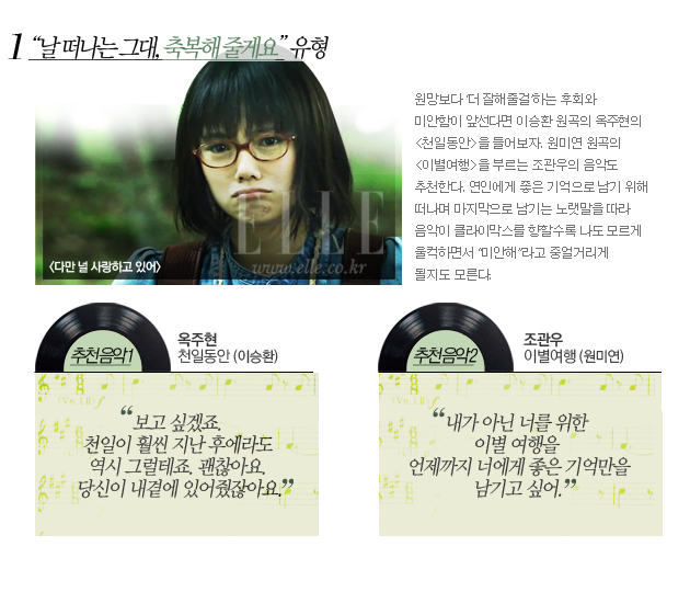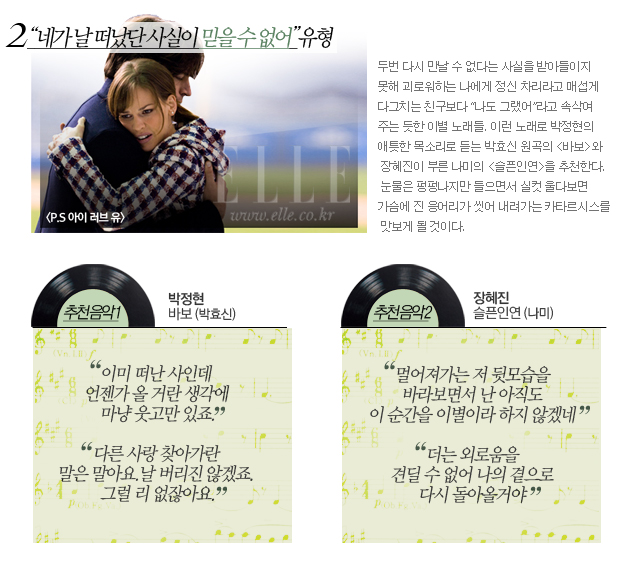 깨진 사랑에 마음 아파 남몰래 베겟잇을 적실 때, 상처입은 마음을 위로받고 싶을 때, 이별한 남녀는 음악을 듣는다. 그것이 나를 더 슬프게 할 수 있다는 것을 알면서도. 마치 내 맘을 읽기라도 한 듯 “다 알아”라고 토닥이는 이별 노래들. 세상에 넘쳐나는 수많은 이별 노래의 가사들 중 ‘나는 가수다’에서 새롭게 편곡된 노래의 가사를 통해 카타르시스를 느껴보시길.