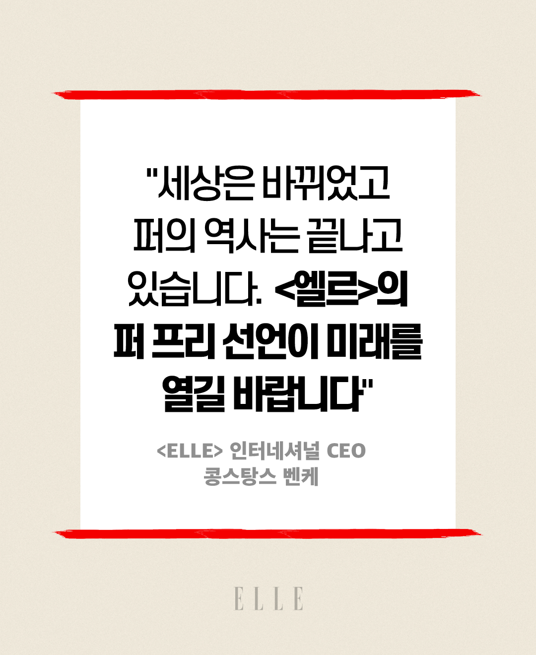 “세상은 바뀌었고 퍼의 역사는 끝나고 있습니다.<엘르>의 퍼 프리 선언이 미래를 열길 바랍니다.”_<엘르> 인터네셔널 CEO 콩스탕스 벤케