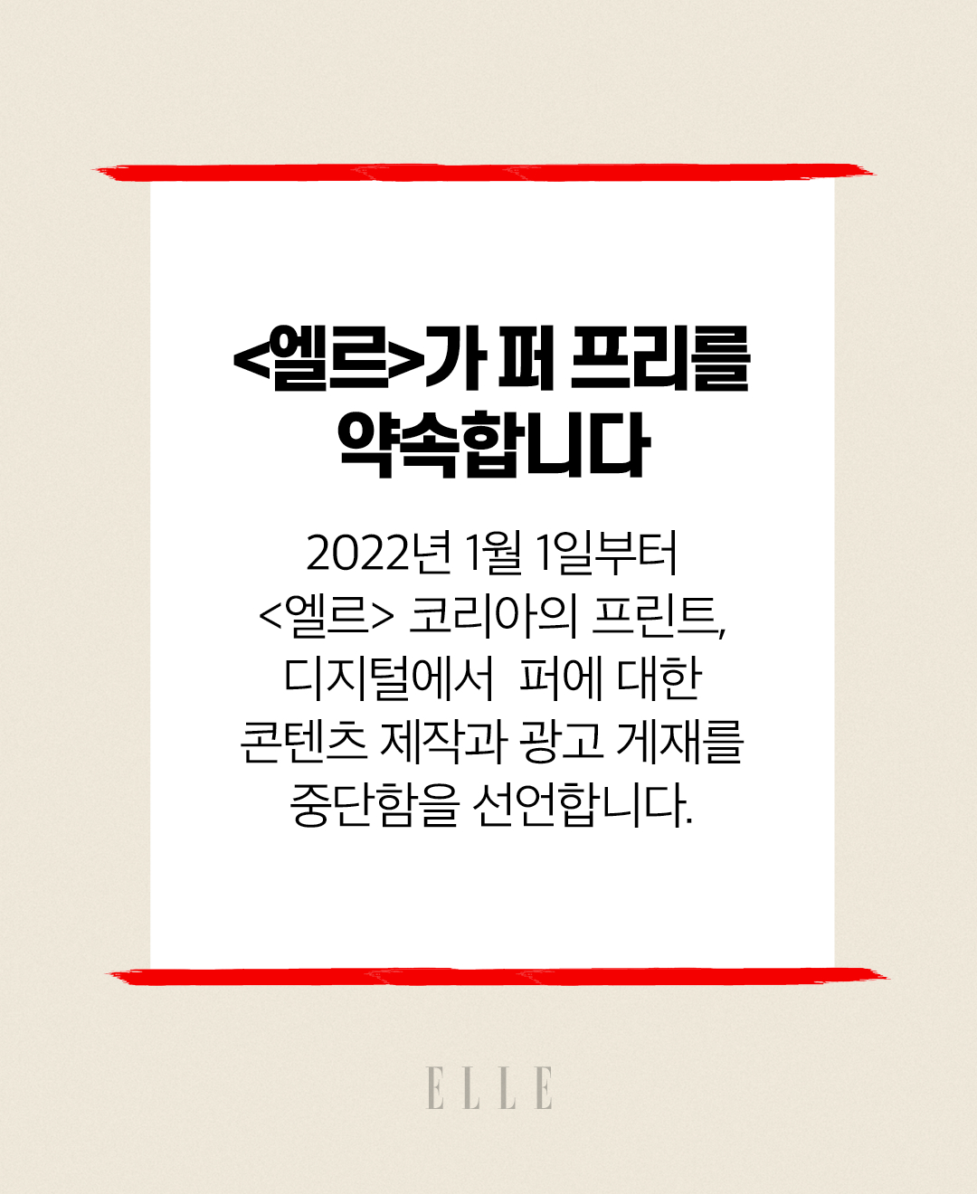 “지속가능성과 동물권 등에 꾸준히 관심을 가져온 <엘르> 코리아는 그동안 우리가 일깨워온 퍼 프리에 대한 존중을 더 강화해 2022년 1월 1일부터 정책적으로 시작합니다. 앞으로 우리가 꼿꼿하게 지켜나갈 이 다짐이 선한 영향력으로 이어지길 기대합니다.”_<엘르> 코리아 편집장 채은미