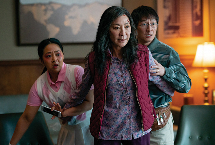 스틸 이미지만 봐서는 도무지 종잡을 수 없는 영화. 이혼을 요구하는 남편과 삐딱하게 구는 딸에 둘러싸여 힘겨운 이민생활을 이어가던 에블린(양자경)이 메타버스에서 수많은 자아를 경험하며 세상을 구한다는 이야기. 하드코어적인 연출 사이에 문득 찾아오는 깨달음이 결코 작지 않다. 10월 12일 개봉. 에브리씽 에브리웨어 올 앳 원스