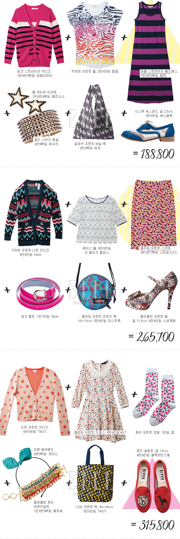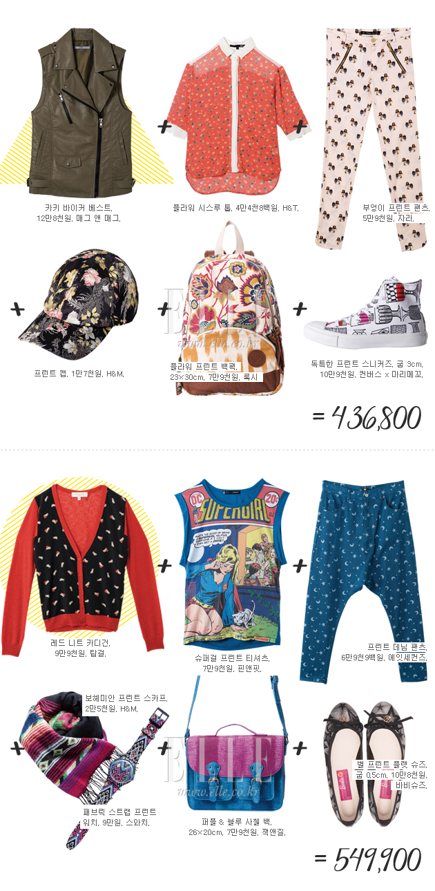 10만원대부터 50만원대까지 <엘르걸>이 엄선한 버짓 쇼핑 가이드를 참고해 과감하고 화려한 프린트 룩을 즐겨볼 것.