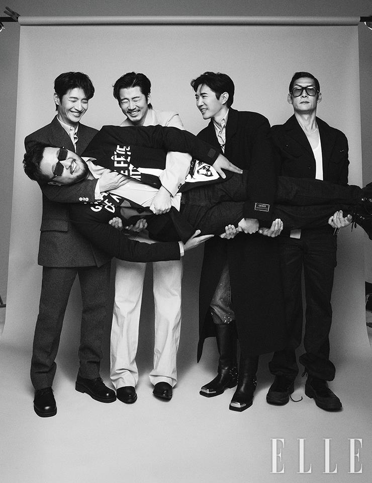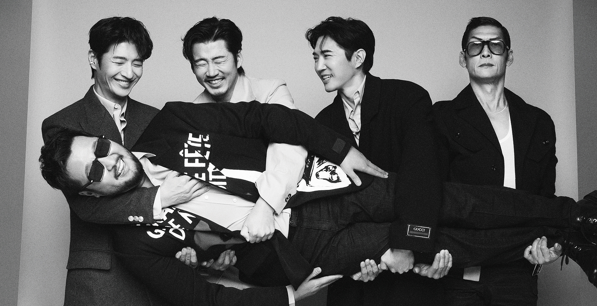 손호영이 입은 더블 재킷과 팬츠, 셔츠는 모두 Gucci. 윤계상이 입은 재킷과 팬츠, 슬리브리스는 모두 Bottega Veneta. 슈즈는 Our Legacy. 데니 안이 입은 블랙 롱 코트와 셔츠, 슈즈는 모두 Gucci. 데님 팬츠는 Levi’s. 박준형이 입은 바이커 재킷과 팬츠, 슈즈는 모두 Alexander McQueen. 아이웨어는 J.T.O Originals. 김태우가 입은 블랙 재킷은 Raf simons by Mue. 이너 셔츠는 Deum-Jig. 슈즈는 Ami.