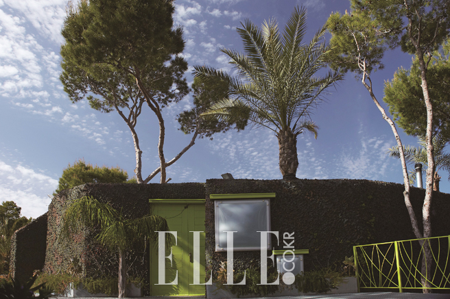 별장 외부는 대문의 네온 그린 컬러만 빼면 숲과 다름없이 보인다.