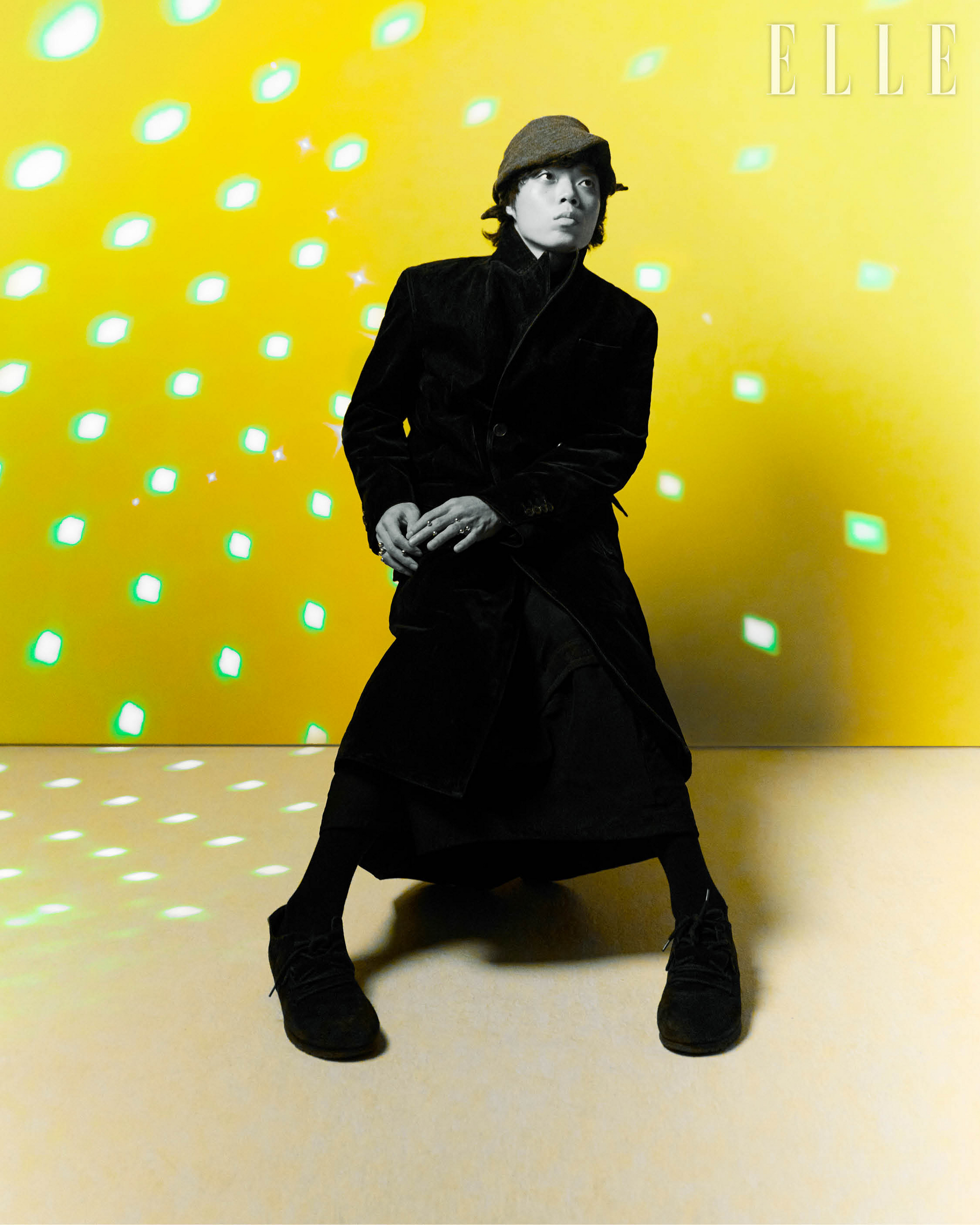 벨벳 코트는 Dusty White. 모자와 팬츠, 슈즈는 모두 스타일리스트 소장품.