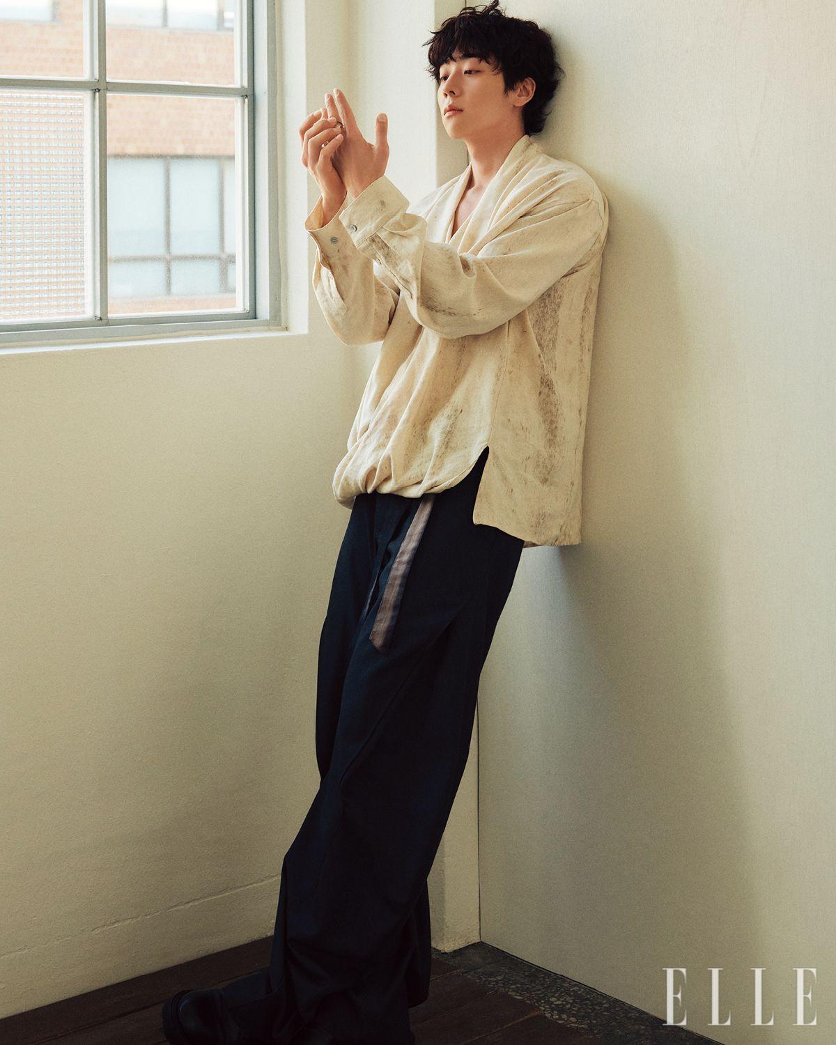 드레이프 셔츠와 벨티드 팬츠는 모두 Jiyong Kim by 10 Corso Como Seoul. 블랙 더비 슈즈는 스타일리스트 소장품.