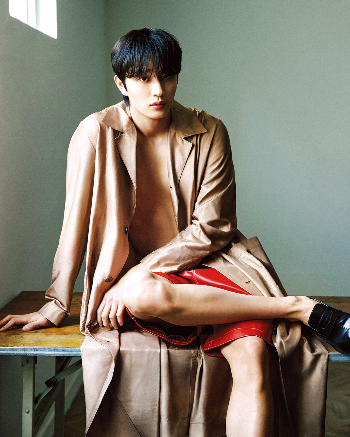 베이지 롱 트렌치코트와 레드 레더 쇼트팬츠는 모두 Kimseoryong Homme.