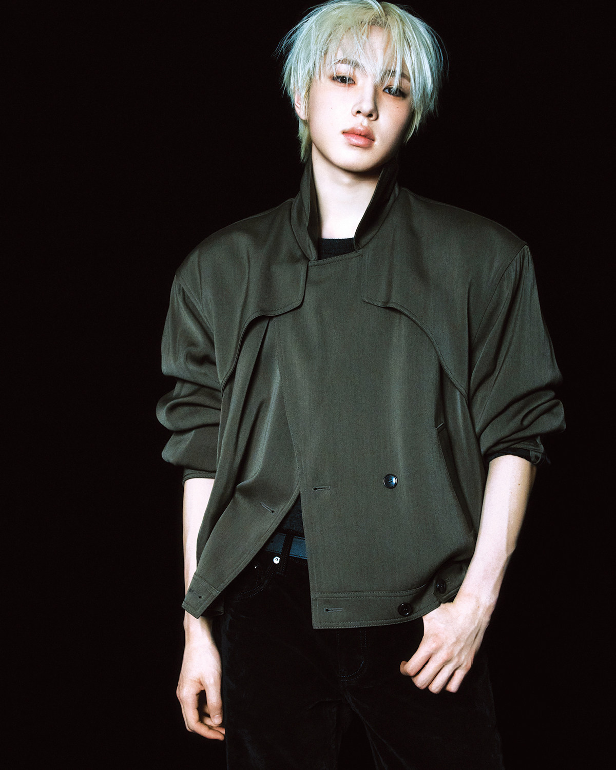 밀리터리 무드의 카키 재킷과 이너 톱은 모두 Recto. 블랙 부츠컷 데님은 Purple Brand. 벨트는 스타일리스트 소장품.